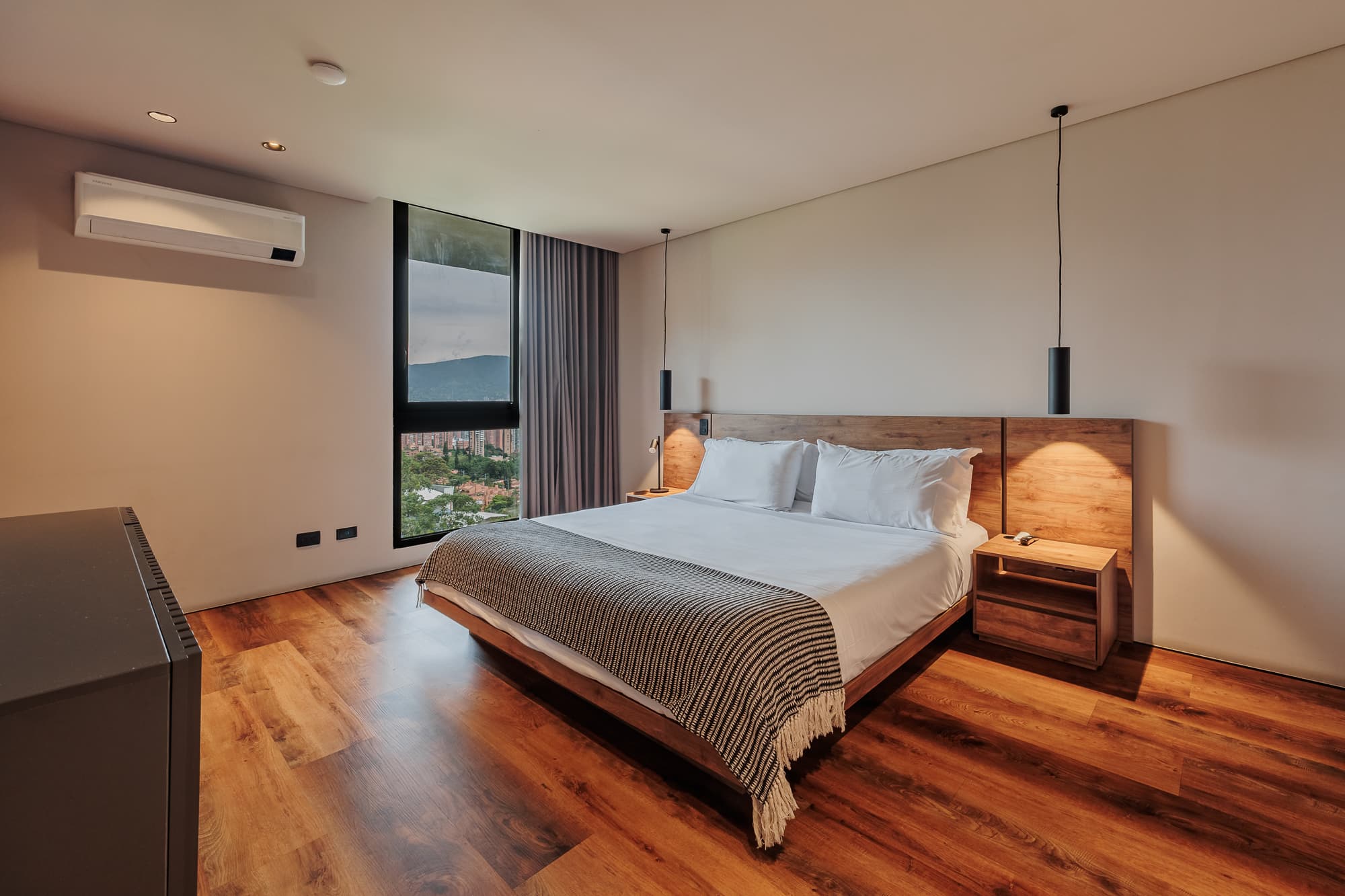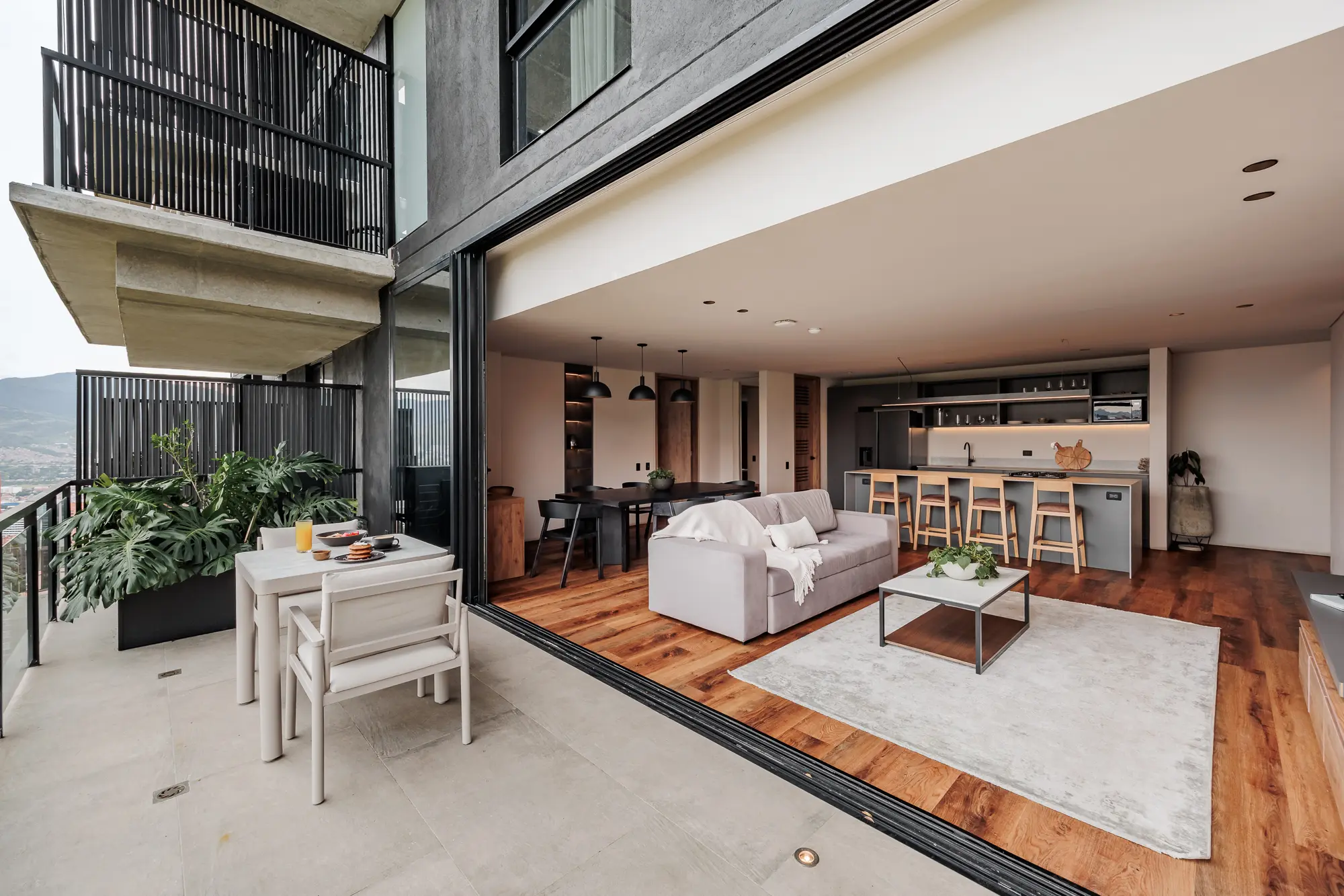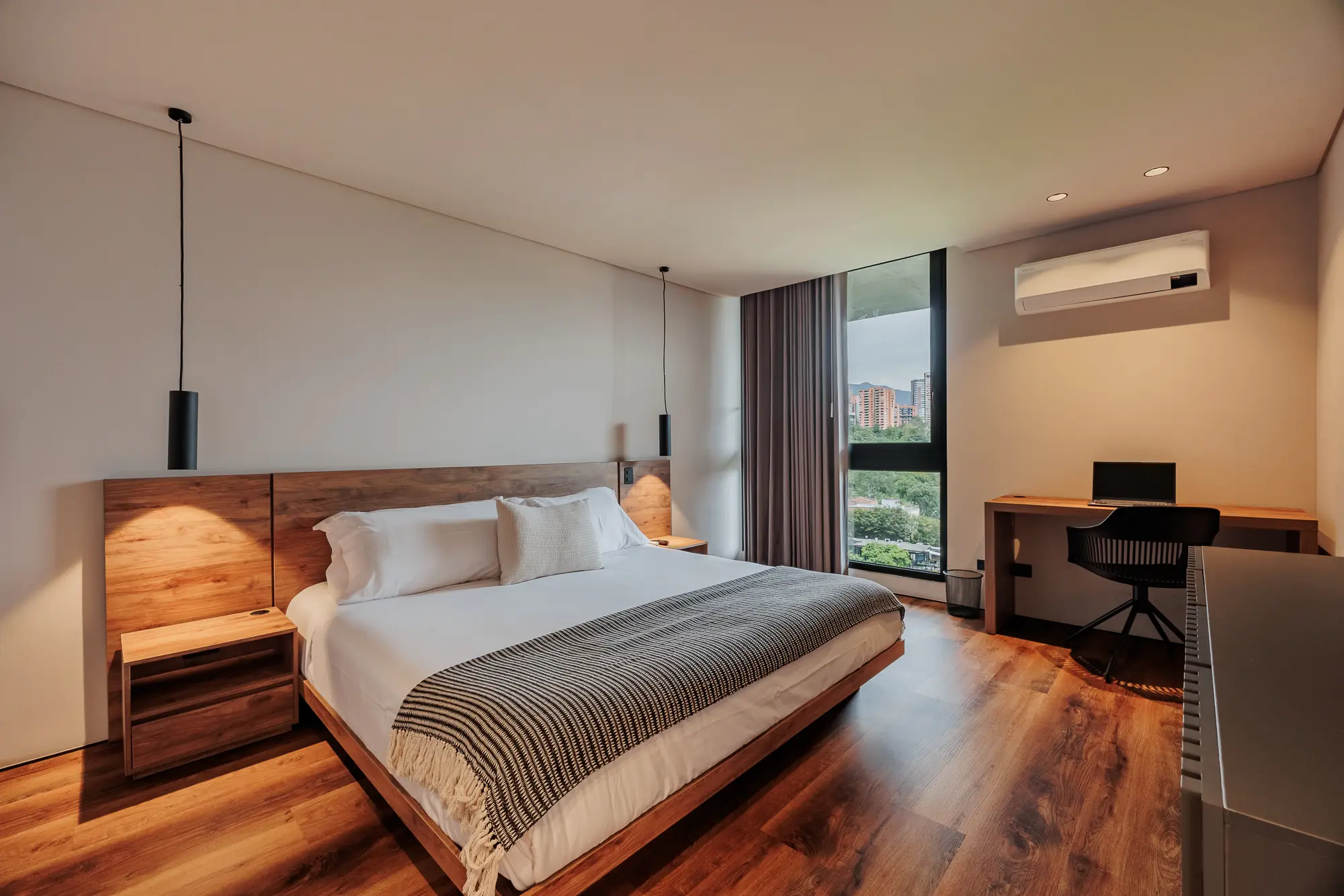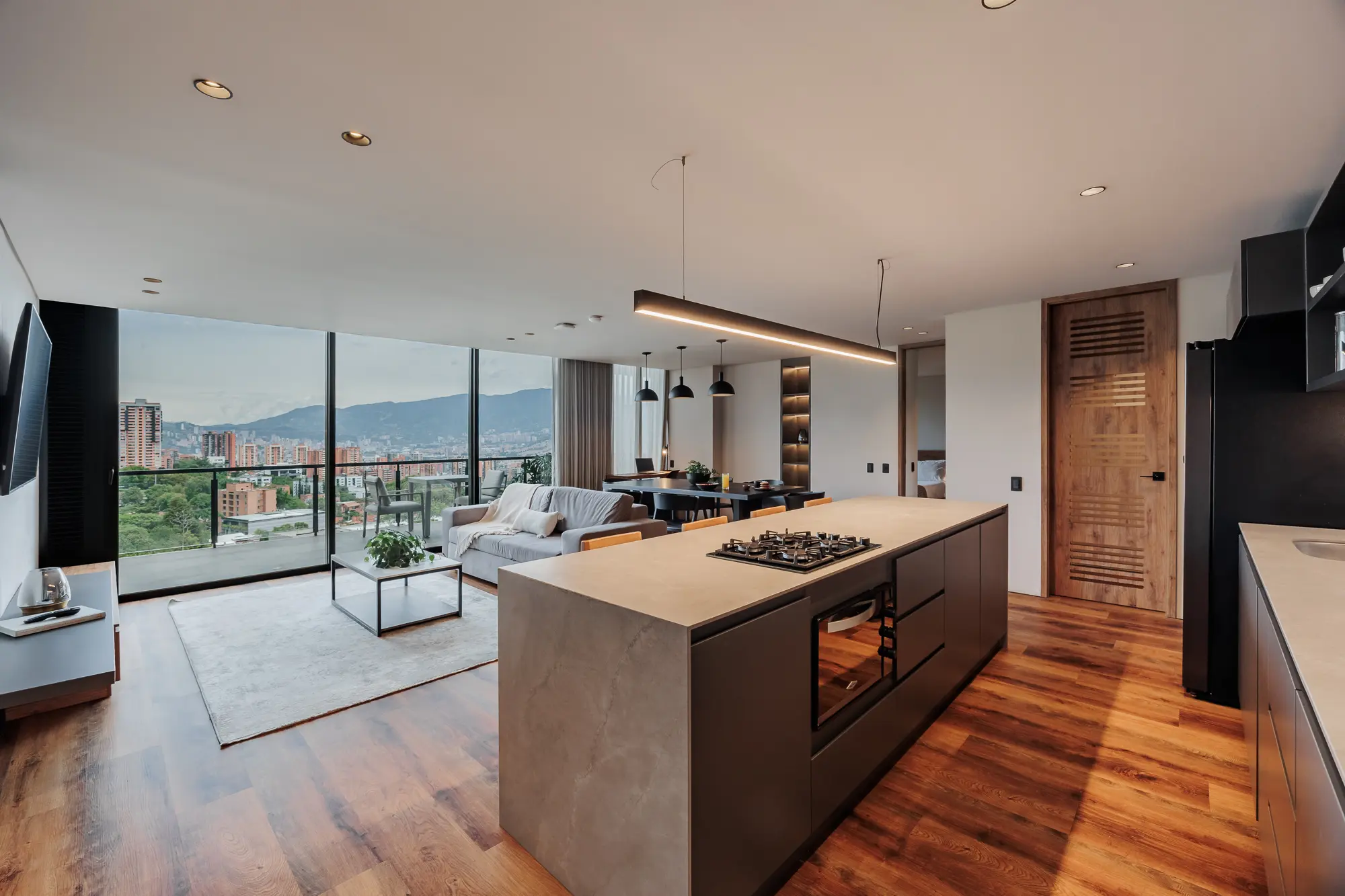 This spacious suite features two master bedrooms with king-size beds, two full bathrooms, and a private balcony overlooking Medellín. Enjoy an island-style kitchen, dining area for six, a beautifully furnished living space, and high-speed WiFi. Whether entertaining or unwinding, every detail is designed for a premium lifestyle.
