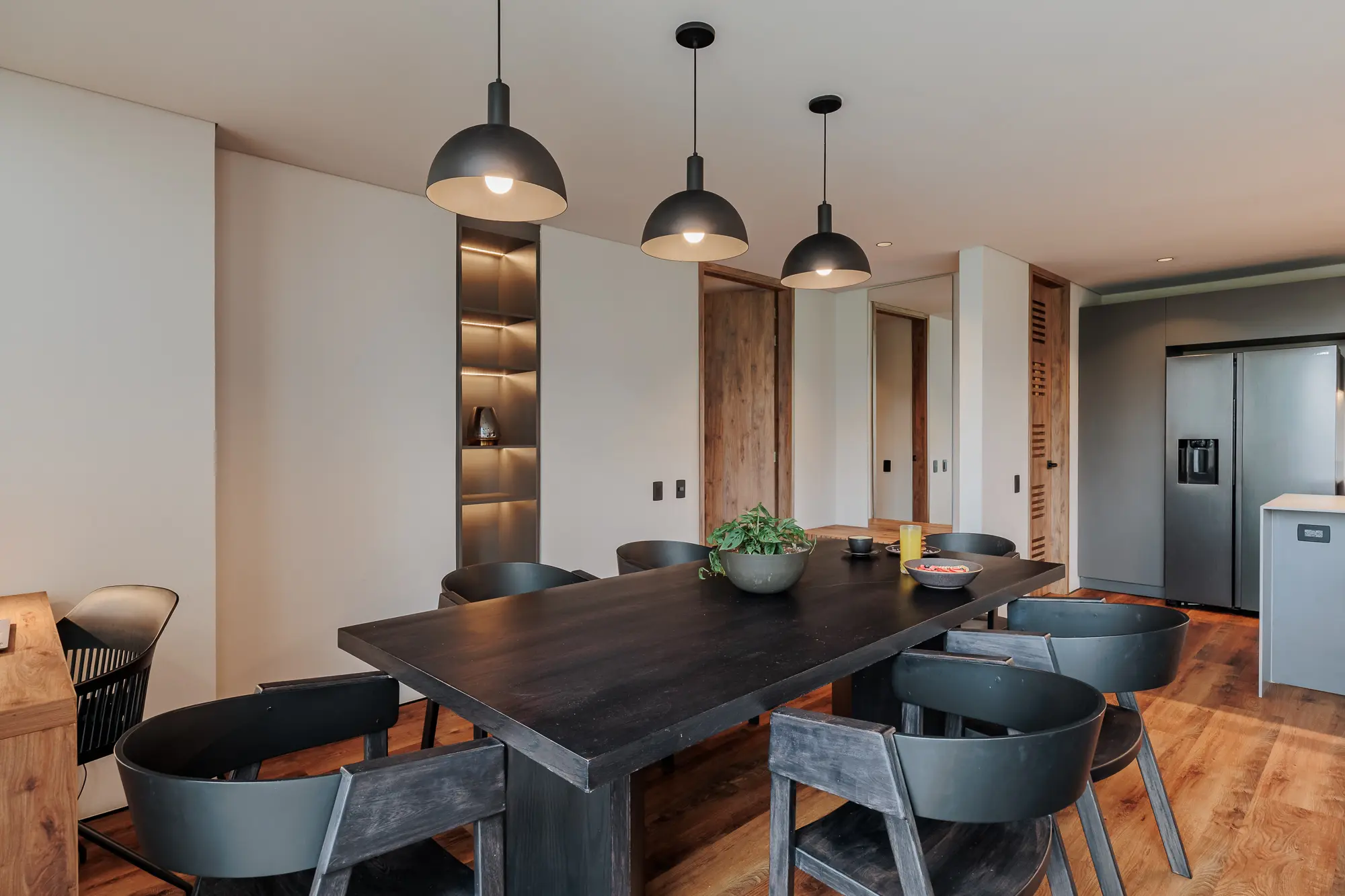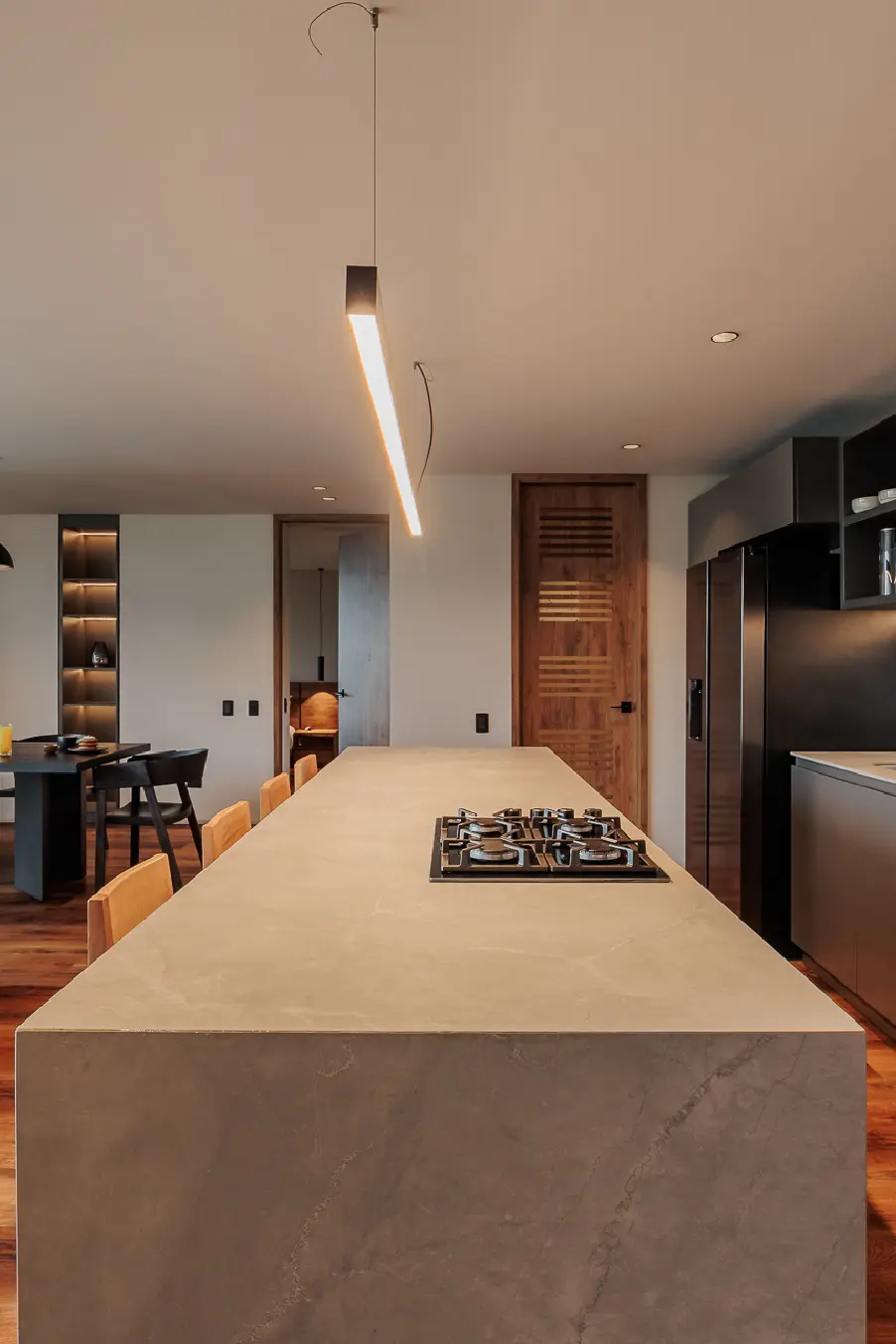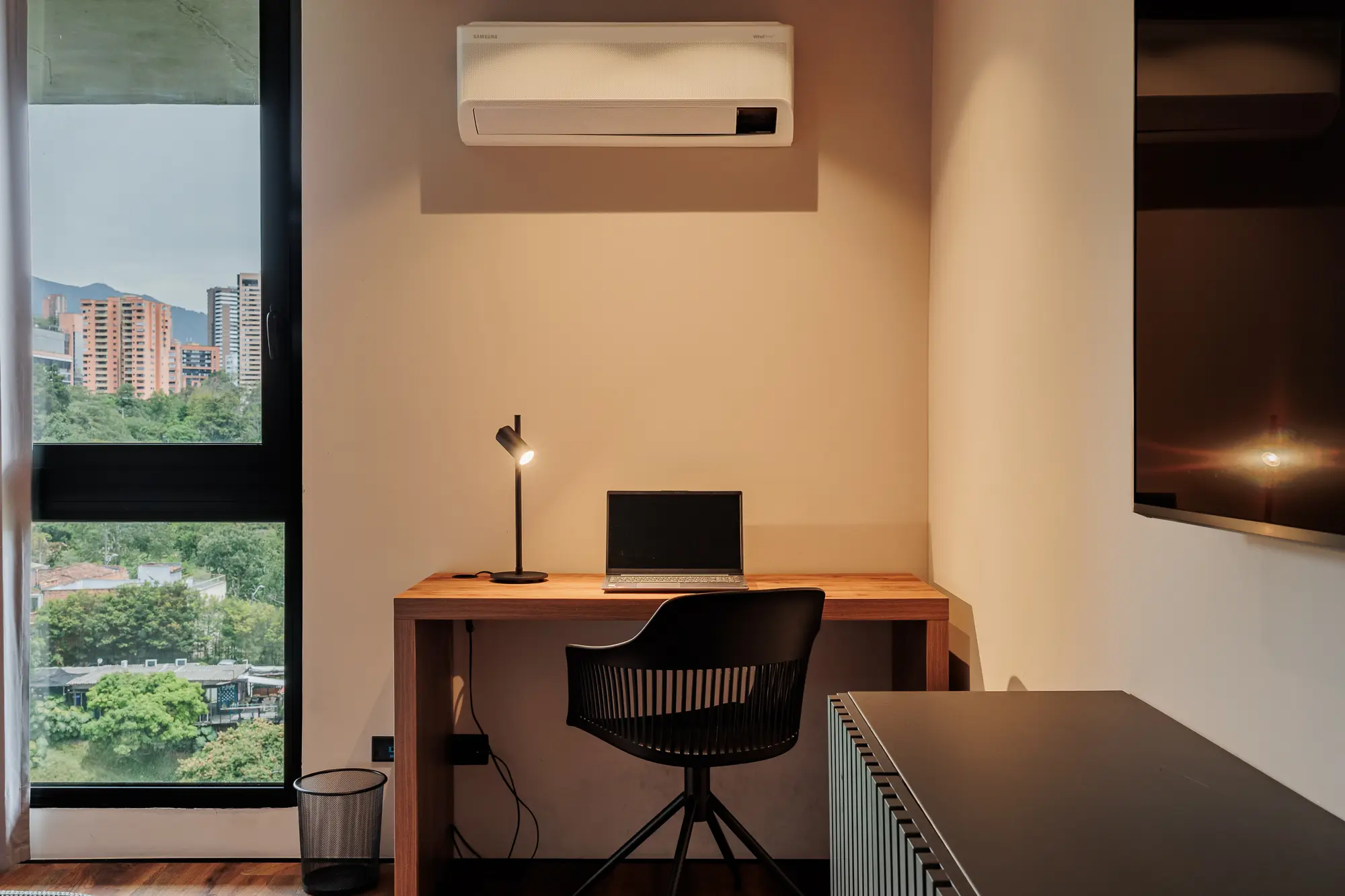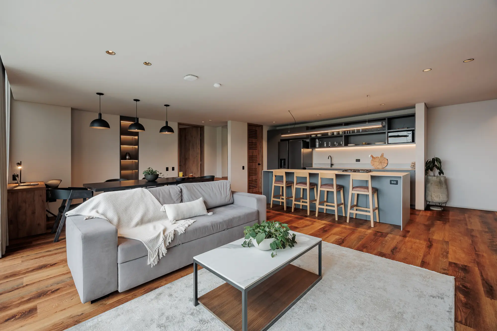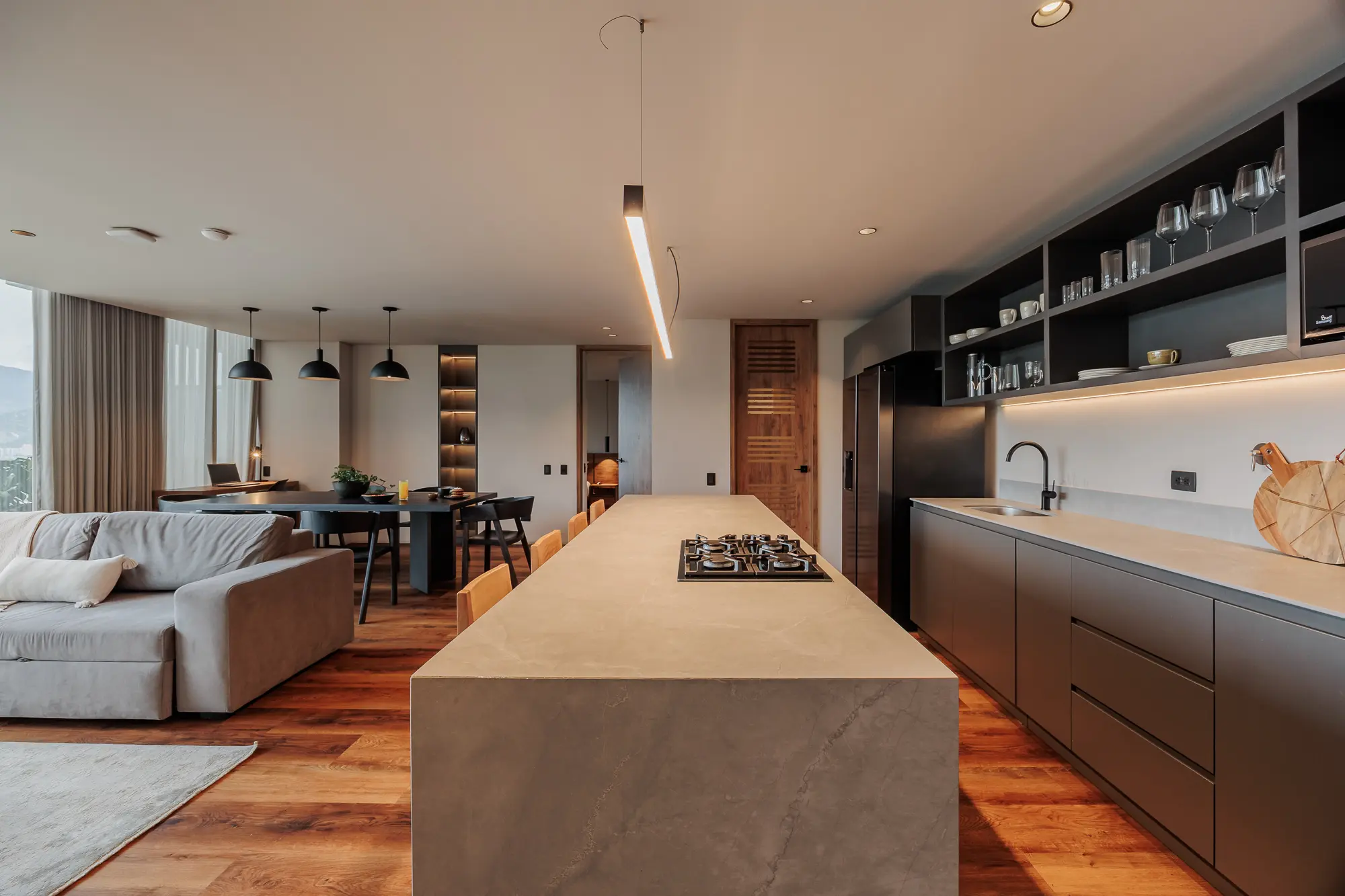 This spacious suite features two master bedrooms with king-size beds, two full bathrooms, and a private balcony overlooking Medellín. Enjoy an island-style kitchen, dining area for six, a beautifully furnished living space, and high-speed WiFi. Whether entertaining or unwinding, every detail is designed for a premium lifestyle.